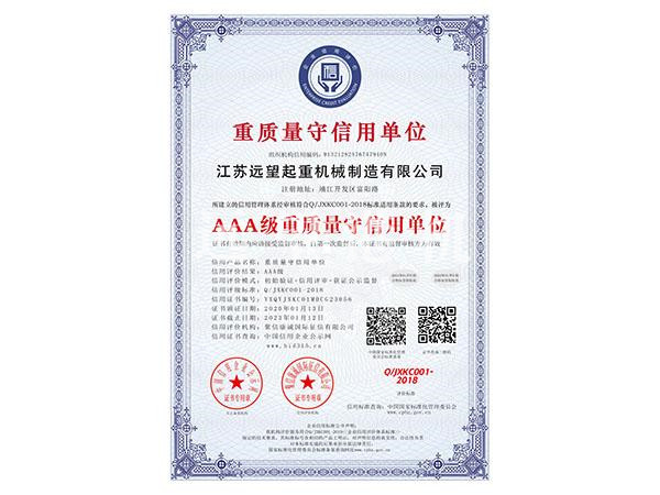 > AAA重质量守信用单位证书